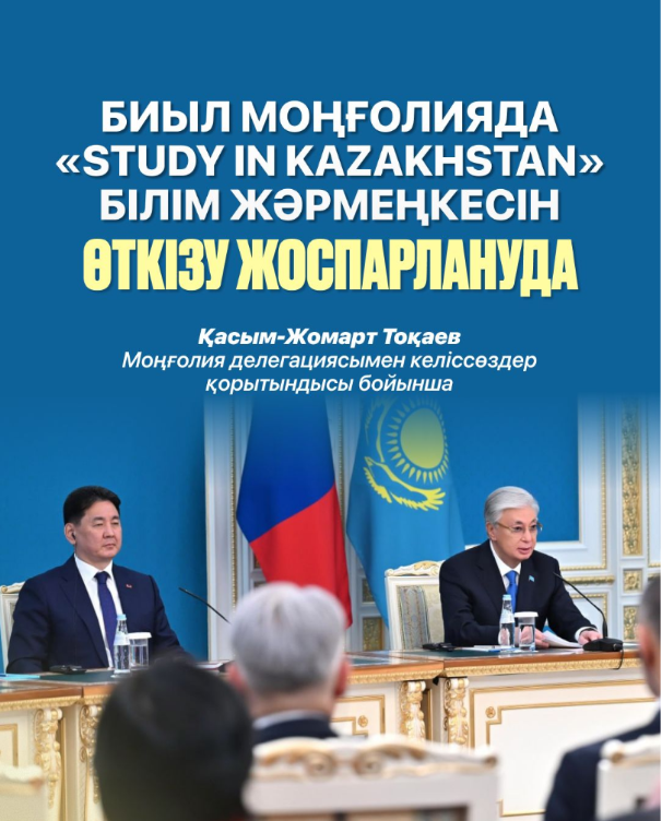 Биыл Моңғолияда «Study in Kazakhstan» білім беру көрмесін өткізу жоспарланып отыр. 22/04/2026 Facebook Twitter WhatsApp Email Ұқсас жаңалықтар Бүгін Астанада Өңірлік экологиялық саммит өтіп жатыр #RES2026 Сегодня в Астане проходит Региональный экологический саммит #RES2026 Главы делегаций, принимающие участие в саммите прибыли в выставочный центр EXPO. Соңғы жаңалықтар Бүгін Астанада Өңірлік экологиялық саммит өтіп жатыр #RES2026 22/04/2026 Сегодня в Астане проходит Региональный экологический саммит #RES2026 22/04/2026 Главы делегаций, принимающие участие в саммите прибыли в выставочный центр EXPO. 22/04/2026 Глава государства провел встречу с Президентом Таджикистана Эмомали Рахмоном 22/04/2026 Мемлекет басшысы Тәжікстан Президенті Эмомали Рахмонмен кездесу өткізді 22/04/2026 Биыл Моңғолияда «Study in Kazakhstan» білім беру көрмесін өткізу жоспарланып отыр. 22/04/2026 Қазақстан мен Моңғолия: экономикалық әріптестіктің жаңа мүмкіндіктері 22/04/2026 Касым-Жомарт Токаев и Ухнаагийн Хурэлсух договорились о расширении взаимодействия 22/04/2026 «Заң мен Тәртіп» – жаңа Конституцияның негізгі қағидаты: Олжас Бектенов құқық бұзушылық профилактикасы жөніндегі ВАК отырысын өткізді 21/04/2026 Премьер-министрдің төрағалығымен құқық бұзушылықтардың алдын алу жөнінде ВАК отырысында көші-қон жағдайы қаралды 21/04/2026
