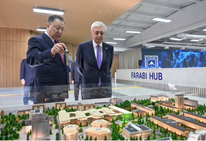 ҚазҰУ ректоры – басқарма төрағасы Жансейіт Түймебаев Мемлекет басшысына Инновациялық өнімдер орталығының және Farabi Hub-тың жоғары технологиялық жобаларын көрсетті.Хаб экономиканың нақты секторына инновациялық әзірлемелер енгізуді көздейтін заманауи платформа ретінде құрылған. Оның базасында креативті индустрия, жасанды интеллект пен стартап жобалары іске асырылады. Осы арқылы 300 жаңа жұмыс орны ашылып, 20 миллион доллардан астам инвестиция тартылды.
